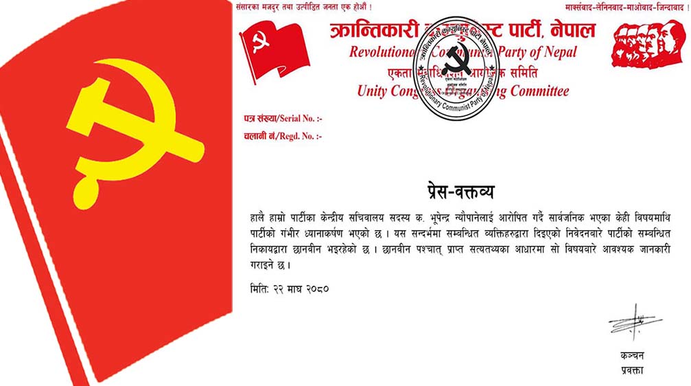 पार्टी प्रवक्ता कञ्चनले सोमबार प्रेस वक्तव्यमार्फत भूपेन्द्र न्यौपानेलाई आरोपित गर्दै सार्वजनिक भएका केही विषयमाथि पार्टीको गम्भीर ध्यानाकर्षण भएको जनाएका छन् । साथै उनले उक्त विषयबारे छानवीन पश्चात् प्राप्त सत्यतथ्यका आधारमा आवश्यक जानकारी गराइने बताए ।