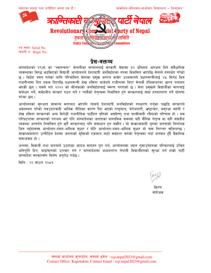 वक्तव्यको अनत्यमा उहाँले विद्यार्थी तथा जनताले उठाएका जायज मागहरु पुरा गर्न, आन्दोलनमा ज्यान गुमाउनेहरुका परिवारलाई उचित क्षतिपूर्ति दिन, घाइतेहरुको उपचार गर्न र बांग्लादेशमा अध्ययनरत नेपाली विद्यार्थीहरुको सुरक्षा गर्न हाम्रो पार्टी बांग्लादेश सरकारसँग विशेष अनुरोध गर्दछ भन्नु भएको छ ।