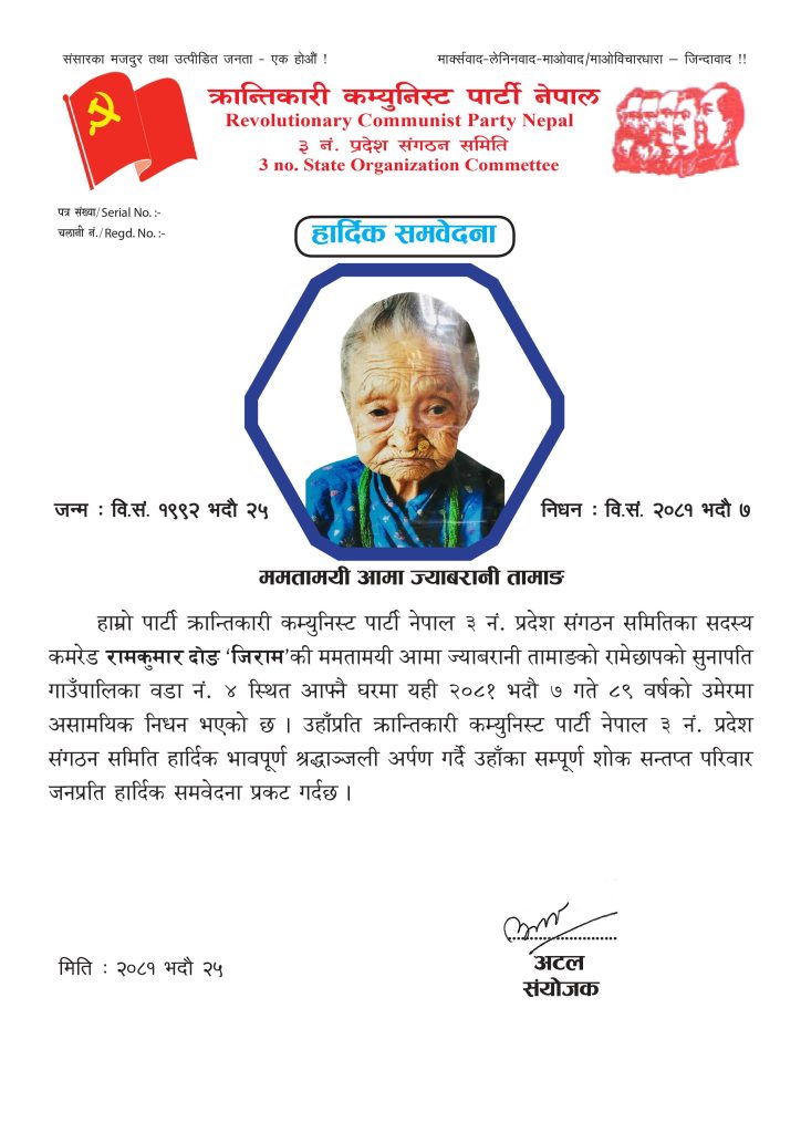 काठमाडाैँ : क्रान्तिकारी कम्युनिस्ट पार्टी नेपाल ३ नं. प्रदेश संगठन समितिका सदस्य कमरेड रामकुमार दोङ ‘जिराम’की ममतामयी आमा ज्याबरानी तामाङको ८९ वर्षको उमेरमा असामयिक निधन भएकोमा क्रान्तिकारी कम्युनिस्ट पार्टी नेपाल ३ नं. प्रदेश संगठन समितिव्दारा निम्न विज्ञप्ती प्रकाशित गर्दै हार्दिक श्रद्धाञ्जली अर्पण गरेको छ :