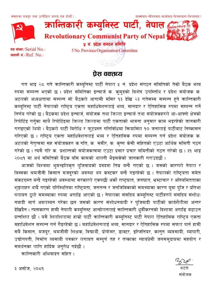 विज्ञप्तिमा भनिएकाे छ, ‘गत भाद्र २८ गते क्रान्तिकारी कम्युनिस्ट पार्टी नेपाल ५ नं. प्रदेश संगठन समितिको तेस्रो बैठक भव्य रुपमा सम्पन्न भएको छ । प्रदेश समितिका इन्चार्ज क. कुमुदको विशेष उपस्तिथि र प्रदेश संयोजक क अटलको अध्यक्षतामा सम्पन्न सो बैठकले आगामी मंसिर १३ देखि २३ गतेसम्म सम्पन्न हुने क्रान्तिकारी कम्युनिस्ट पार्टी नेपालको राष्ट्रिय एकता महाधिवेशनलाई भव्य, सानदार र ऐतिहासिक रुपमा सम्पन्न गर्ने निर्णय गरेको छ । बैठकमा प्रदेश इन्चार्ज, संयोजक तथा जिल्ला इन्चार्ज तथा संयोजकहरुले आ-आफ्नो क्षेत्रको रिपोर्टिङ गर्नुका साथै रिपोर्टिङमा जिल्ला जिल्लामा पार्टी एकताको भावना अनुसार काम भइरहेको जानकारी गराइएको थियो । बैठकले पार्टी विरोधि र फुटप्रस्त गतिविधिमा क्रियासिल १० जनालाई पार्टीबाट निष्कासन गरिएको छ । राष्ट्रिय एकता महाधिवेशनलाई भव्य र ऐतिहासिक रुपमा सम्पन्न गर्न प्रदेश संयोजक क अटनको नेतृत्वमा सह संयोजकहरु क. गति, क. समीर, क. कृष्ण केसी सहितको एउटा आर्थिक समिती गठन गरेको छ । त्यसै गरि क. प्रशान्तको संयोजकत्वमा एउटा प्रसार प्रचार समितीको गठन गरेको छ । ३१ भाद्र २०८१ मा अर्थ समितिको बैठक बसि कामको थालनी भैइसकेको जानकारी गराउदछौ ।