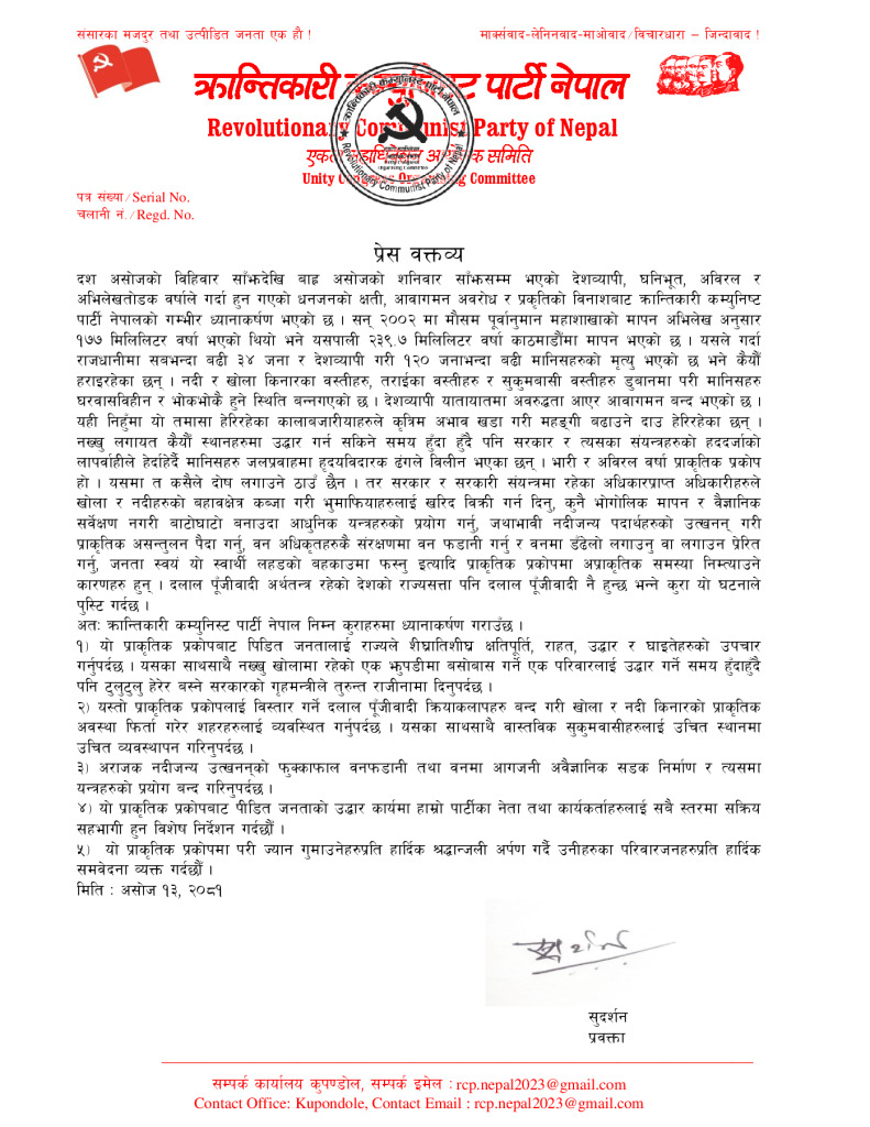 “दश असोजको विहिवार साँझदेखि बाह्र असोजको शनिवार साँझसम्म भएको देशव्यापी, घनिभूत, अविरल र अभिलेखतोडक वर्षाले गर्दा हुन गएको धनजनको क्षती, आवागमन अवरोध र प्रकृतिको विनाशबाट क्रान्तिकारी कम्युनिष्ट पार्टी नेपालको गम्भीर ध्यानाकर्षण भएको छ । सन् २००२ मा मौसम पूर्वानुमान महाशाखाको मापन अभिलेख अनुसार १७७ मिलिलिटर वर्षा भएको थियो भने यसपाली २३९.७ मिलिलिटर वर्षा काठमाडौँमा मापन भएको छ । यसले गर्दा राजधानीमा सबभन्दा बढी ३४ जना र देशव्यापी गरी १२० जनाभन्दा बढी मानिसहरुको मृत्यु भएको छ भने कैयौँ हराइरहेका छन् । नदी र खोला किनारका वस्तीहरु, तराईका वस्तीहरु र सुकुमबासी वस्तीहरु डुबानमा परी मानिसहरु घरवासविहीन र भोकभोकै हुने स्थिति बन्नगएको छ । देशव्यापी यातायातमा अवरुद्धता आएर आवागमन बन्द भएको छ । यही निहँुमा यो तमासा हेरिरहेका कालाबजारीयाहरुले कृत्रिम अभाव खडा गरी महङ्गी बढाउने दाउ हेरिरहेका छन् । नख्खु लगायत कैयौँ स्थानहरुमा उद्धार गर्न सकिने समय हुँदा हुँदै पनि सरकार र त्यसका संयन्त्रहरुको हददर्जाको लापर्वाहीले हेर्दाहेर्दै मानिसहरु जलप्रवाहमा हृदयविदारक ढंगले विलीन भएका छन् । भारी र अविरल वर्षा प्राकृतिक प्रकोप हो । यसमा त कसैले दोष लगाउने ठाउँ छैन । तर सरकार र सरकारी संयन्त्रमा रहेका अधिकारप्राप्त अधिकारीहरुले खोला र नदीहरुको बहावक्षेत्र कब्जा गरी भुमाफियाहरुलाई खरिद विक्री गर्न दिनु, कुनै भोगोलिक मापन र वैज्ञानिक सर्वेक्षण नगरी बाटोघाटो बनाउदा आधुनिक यन्त्रहरुको प्रयोग गर्नु, जथाभावी नदीजन्य पदार्थहरुको उत्खनन् गरी प्राकृतिक असन्तुलन पैदा गर्नु, वन अधिकृतहरुकै संरक्षणमा वन फडानी गर्नु र वनमा डँढेलो लगाउनु वा लगाउन प्रेरित गर्नु, जनता स्वयं यो स्वार्थी लहडको बहकाउमा फस्नु इत्यादि प्राकृतिक प्रकोपमा अप्राकृतिक समस्या निम्त्याउने कारणहरु हुन् । दलाल पूँजीवादी अर्थतन्त्र रहेको देशको राज्यसत्ता पनि दलाल पूँजीवादी नै हुन्छ भन्ने कुरा यो घटनाले पुस्टि गर्दछ ।