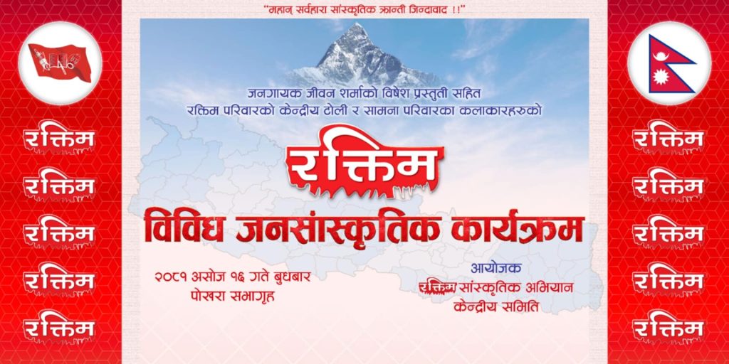 पोखरा : रक्तिम साँस्कृतिक अभियानले असोज १६ गते पोखरामा सम्पन्न गर्न गइरहेको साँस्कृतिक प्रस्तुति हुँदैछ । रक्तिम सास्कृतिक अभियानका केन्द्रीय अध्यक्ष नारायण शर्माले मंगलबार हाँक सित कुरा गर्दै सो कुराको जानकारी गराएका हुन् । अध्यक्ष शर्माले पोखरास्थित पोखरा सभागृहमा दिउँसो २ बजे देखि ५ बजेसम्म विशेष साँस्कृतिक प्रस्तुति रहने बताए ।