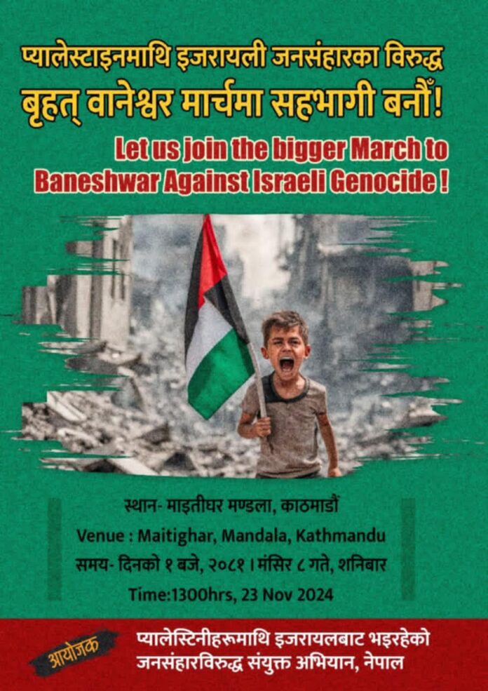 काठमाडौं : संयुक्त अभियान नेपालले प्यालेस्टाइन माथिको इजरायली जनसंहार विरुद्ध मङ्सिर ८ गते काठमाडौमा प्रदर्शन गर्दैछ । दिउँसो १ बजे माइतीघर मण्डलाबाट नयाँ बानेश्वर सम्म जुलुस हुने आयोजकहरूले बताएका छन्