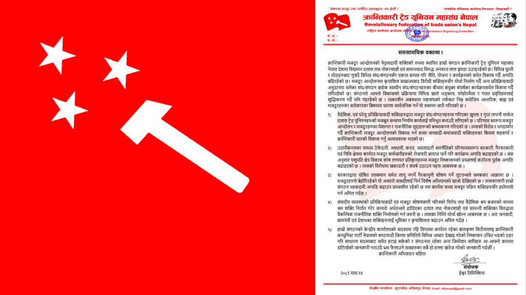 काठमाडौं : क्रान्तिकारी कम्युनिस्ट पार्टी नेपाल निकट क्रान्तिकारी ट्रेड युनियन महासंघले समसामयिक विषयमा पाँच बुँदे धारणा सार्वजनिक गरेको छ । महासंघका केन्द्रीय संयोजक इश्वर तिमल्सिनाले सोमबार एक वक्तव्यमार्फत् महासंघको समसामयिक विषयमा धारणा सार्वजनिक गर्नुभएको हो ।