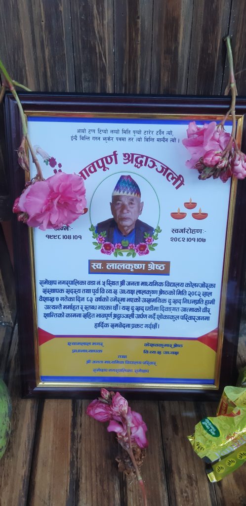 रामेछाप नगरपालिका वडा नं. ५ स्थित श्री जनता माध्यमिक विद्यालय कोलन्जोरका संस्थापक सदस्य तथा पूर्व वि व्य.स. अध्यक्ष लालकृष्ण श्रेष्ठको मिति २०८२ साल वैशाख ७ गतेका दिन ८३ वर्षको उमेरमा भएको असामयिक दुःखद निधनप्रति हामी अत्यन्तै मर्माहत र स्तब्ध भएका छौं। यस दुःखद् घडीमा दिवङ्गत आत्माको चीर शान्तिको कामना सहित भावपूर्ण श्रद्धाञ्जली अर्पण गर्दै शोकाकुल परिवारजनमा हार्दिक समवेदना प्रकट गर्दछौं।
