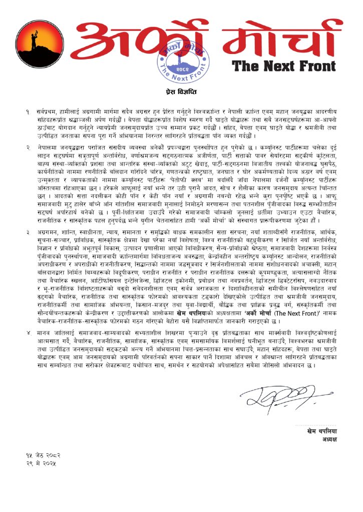 “आफू समाजवादी मुटु हालेर बाँच्ने अनि गतिशील समाजवादी मुनालाई निमोठ्ने मरणासन्न तथा पतनशील पुँजीवादका विरुद्ध सम्झौताहीन सङ्घर्ष अपरिहार्य बनेको छ । पूर्वी–क्षितिजमा उदाउँदै गरेको समाजवादी चम्किलो जूनलाई धर्तीमा उभ्याउन एउटा वैचारिक, राजनीतिक र सांस्कृतिक पहल हुनुपर्दछ भन्ने युगीन चेतनासहित हामी ‘अर्को मोर्चा’ को संस्थागत प्रारूपीकरणमा जुटेका हौँ ।” विज्ञप्तिमा उल्लेख छ ।