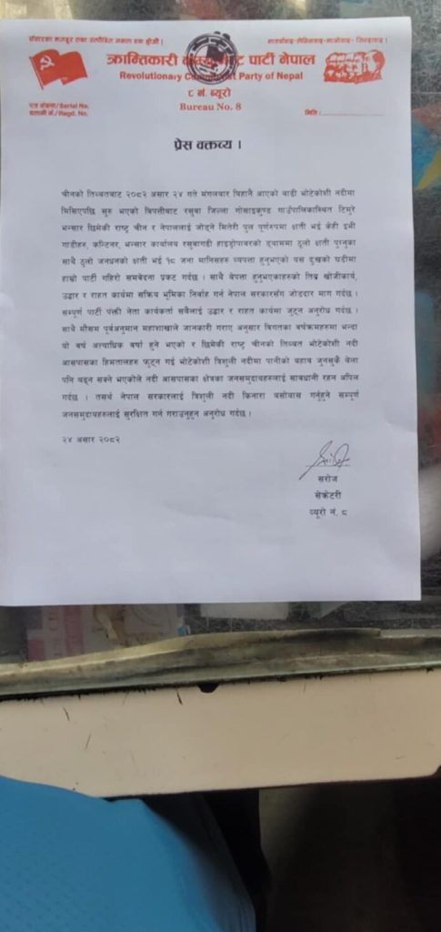 चीनको तिब्बतबाट २०८२ असार २४ गते मंगलबार बिहानै आएको बाढी भोटेकाशी नदीमा मिसिएपछि शुरु भएको विपत्तिबाट रसुवा जिल्ला गोसाइँकुण्ड गाउँपालिकास्थित टिमुरे भन्सार छिमेकी राष्ट्र चीन र नेपाललाई जोड्ने मितेरी पुल पूर्णरुपमा क्षति भइ केही हेभी गाडीहरु, कन्टेनर, भन्सार कार्यालय र रसुवागढी हाइड्रोपावरको ड्याममा ठूलो क्षति पुग्नुका साथै ठूलो जनधनको क्षति भइ १८ जना मानिसहरु वेपत्ता हुनुभएको यस दुःखको घडीमा हाम्रो पार्टी गहिरो समवेदना प्रकट गर्दछ । साथै वेपत्ता हुनुभएकाहरुको तीव्र खोजी कार्य उद्धार र राहत कार्यमा सक्रिय भुमिका निर्वाह गर्न नेपाल सरकारसँग जोडदार माग गर्दछ । सम्पूर्ण पार्टी पङ्क्ति नेता कार्यकर्ता सबैलाई उद्धार राहत कार्यमा जुट्न अनुरोध गर्दछ । साथै मौसम पूर्वानुमान महाशाखाले जानकारी गराए अनुसार विगतका वर्षक्रमहरुमा भन्दा यो वर्ष अत्यधिक वर्षा हुने भएको र छिमेकी राष्ट्र चीनको तिब्बत भोटेकोशी नदी आसपासका हिमालहरु फुट्न गई भोटेकोशी त्रिशुली नदीमा पानीको बहाव जुनसुकै बेला पनि बढ्न सक्ने भएकोले नदी आसपासका क्षेत्रका समुदायलाई सावधानी रहन अपील गर्दछ । तसर्थ नेपाल सरकालाई त्रिशुली नदी किनारामा बसोबास गर्नु हुने सम्पूर्ण जनसमुदायहरुलाई सुरक्षित गर्न गराउनु हुन अनुरोध गर्दछ ।