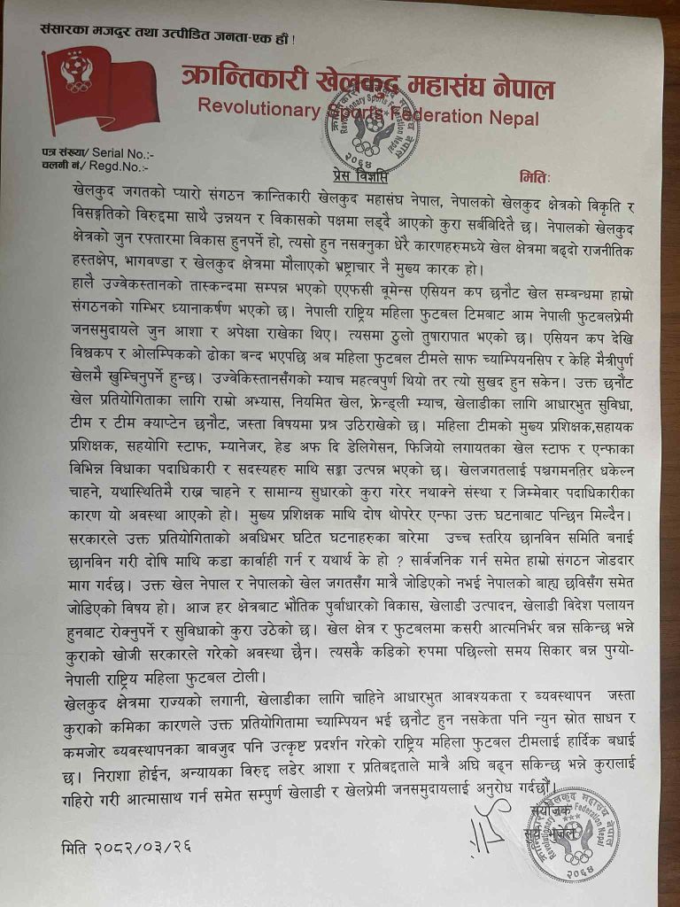हालै उज्वेकस्तानको तास्कन्दमा सम्पन्न भएको एएफसी वूमेन्स एसियन कप छनौट खेल सम्बन्धमा हाम्रो संगठनको गम्भिर ध्यानाकर्षण भएको छ। नेपाली राष्ट्रिय महिला फुटबल टिमबाट आम नेपाली फुटबलप्रेमी जनसमुदायले जुन आशा र अपेक्षा राखेका थिए। त्यसमा ठुलो तुषारापात भएको छ। एसियन कप देखि विश्वकप र ओलम्पिकको ढोका बन्द भएपछि अब महिला फुटबल टीमले साफ च्याम्पियनसिप र केहि मैत्रीपुर्ण खेलमै खुम्चिनुपर्ने हुन्छ। उज्वेकिस्तानसँगको म्याच महत्वपुर्ण थियो तर त्यो सुखद हुन सकेन। उक्त छनौंट खेल प्रतियोगिताका लागि राम्रो अभ्यास, नियमित खेल, फ्रेन्ड्ली म्याच, खेलाडीका लागि आधारभुत सुविधा, टीम र टीम क्याप्टेन छनौट, जस्ता विषयमा प्रश्न उठिराखेको छ। महिला टीमको मुख्य प्रशिक्षक,सहायक प्रशिक्षक, सहयोगी स्टाफ, म्यानेजर, हेड अफ दि डेलिगेसन, फिजियो लगायतका खेल स्टाफ र एन्फाका विभिन्न विधाका पदाधिकारी र सदस्यहरु माथि सङ्का उत्पन्न भएको छ। खेलजगतलाई पश्चगमनतिर धकेल्न चाहने, यथास्थितिमै राख्न चाहने र सामान्य सुधारको कुरा गरेर नथाक्ने संस्था र जिम्मेवार पदाधिकारीका कारण यो अवस्था आएको हो। मुख्य प्रशिक्षक माथि दोष थोपरेर एन्फा उक्त घटनाबाट पन्छिन मिल्दैन। सरकारले उक्त प्रतियोगिताको अवधिभर घटित घटनाहरुका बारेमा उच्च स्तरिय छानविन समिति बनाई छानविन गरी दोषि माथि कडा कार्वाही गर्न र यथार्थ के हो रु सार्वजनिक गर्न समेत हाम्रो संगठन जोडदार माग गर्दछ। उक्त खेल नेपाल र नेपालको खेल जगतसँग मात्रै जोडिएको नभई नेपालको बाह्य छविसँग समेत जोडिएको विषय हो। आज हर क्षेत्रबाट भौतिक पुर्बाधारको विकास, खेलाडी उत्पादन, खेलाडी विदेश पलायन हुनबाट रोक्नुपर्ने र सुविधाको कुरा उठेको छ। खेल क्षेत्र र फुटबलमा कसरी आत्मनिर्भर बन्न सकिन्छ भन्ने कुराको खोजी सरकारले गरेको अवस्था छैन। त्यसकै कडिको रुपमा पछिल्लो समय सिकार बन्न पुग्यो( नेपाली राष्ट्रिय महिला फुटबल टोली।