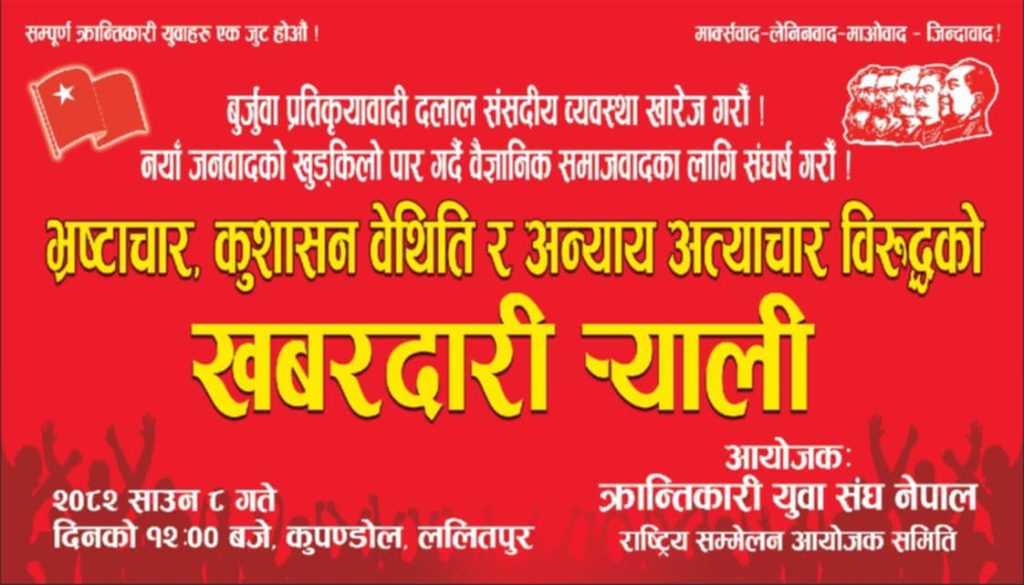 काठमाडाैँ : क्रान्तिकारी युवा संघ नेपाल राष्ट्रिय सम्मेलन आयोजक समितिले भ्रष्टाचार, कुशासन वेथिति र अन्याय अत्याचार विरुद्धको खबरदारी र्याली प्रदर्शन गर्ने भएकाे छ । माेहन वैद्य किरण नेतृत्वकाे क्रान्तिकारी कम्युनिस्ट पार्टी नेपालकाे उक्त साहायक संगठनले भाेली साउन ८ गते मध्यान्न १२ बजे कुपण्डोल पार्टी सम्पर्क कार्यालयमा पार्टीका कार्यबाहक महासचिव सिपी गजुरेल गाैरवले उद्घाटन गर्ने भएकाे जानकारी संगठनका केन्द्रीय संयाेजक सुर्य तिमल्सिनाले दिए ।
