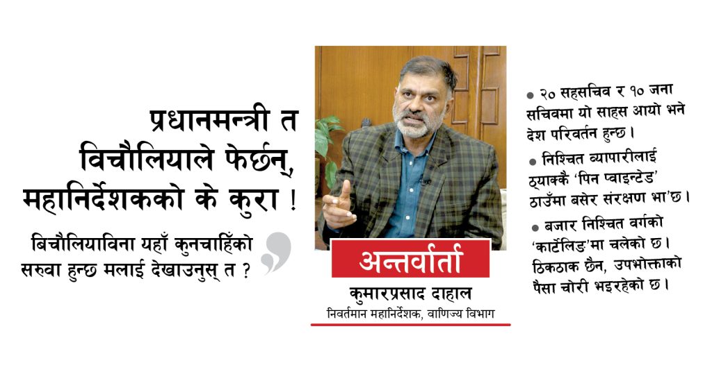 सामान्यतया अवकाशको मुखमा रहेका कर्मचारीलाई सरुवा नगर्ने अभ्यासबिच सरकारले आगामी मंसिरमा अवकाश हुन लागेका वाणिज्य, आपूर्ति तथा उपभोक्ता संरक्षण विभागका महानिर्देशक कुमारप्रसाद दाहालसहित ७२ सहसचिवको सरुवा विवादमा परेको छ । सरुवामा बिचौलियादेखि ‘ह्वाइट कलर’ व्यापारिक समूहको पनि चासो जोडिएको भन्दै प्रश्न उठेको छ । पाँच महिनामै सरुवा गरिएका दाहालसँग विभागमा गरेका काम, अनुगमनमा देखेका तस्बिर, भोगेको राजनीतिक दबाब र सरुवाका कारणबारे नयाँ पत्रिकाका सुवास भट्टले गरेको कुराकानी :