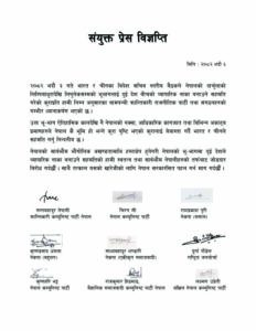 संयुक्तमा वक्तव्यमा क्राीन्तकारी कम्युनिष्ट पार्टी नेपालका सन्तबहादुर नेपाली, नेकपाका चिरन सी ,नेकपा (मसाल)का रामप्रकाश पुरी ,नेकपा बहुमतका कृष्णप्रसाद धमला ,नेकपा एकीकृत समाजवादीका साध्यबहादुर भण्डारी ,राष्ट्रिय जनमोर्चाककी दूर्गा पौडेल ,नेकपाका कृष्णहरी भट्ट ,वैज्ञानिक समाजवादी पार्टीका राजकुमार हिङमाङ ,अखिल नेपाल कम्युनिष्ट पार्टीका लक्ष्मण उप्रेतीले हस्ताक्षर गर्नु भएको छ ।