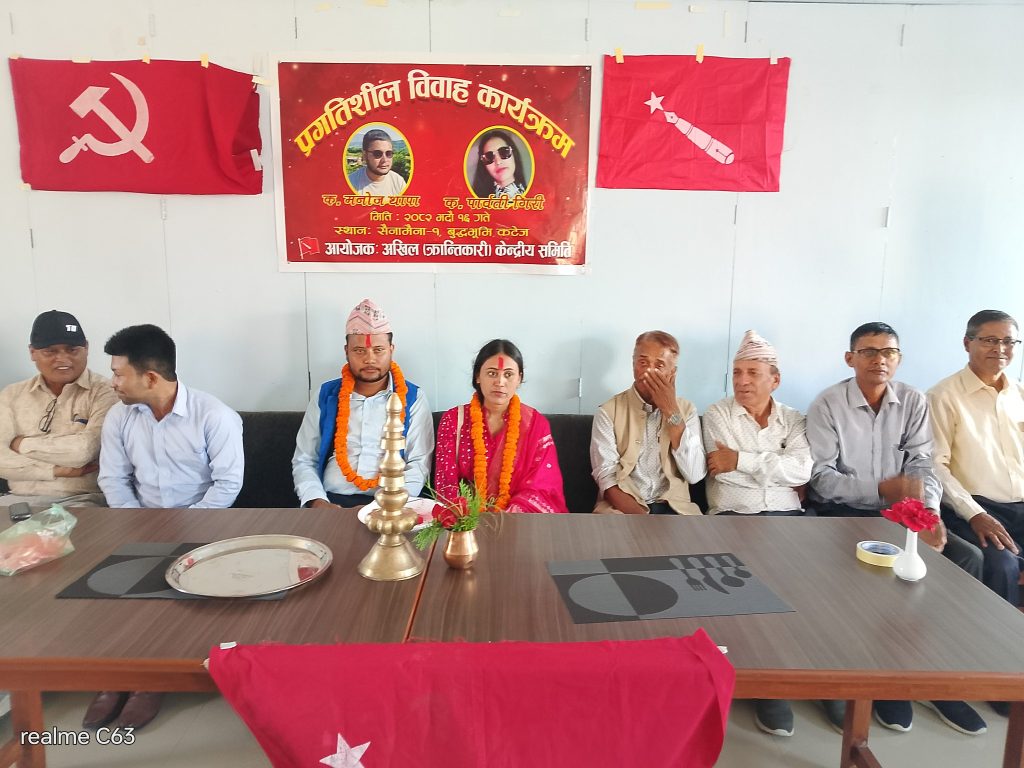 पार्टीका बैकल्पिक पोलिटब्युरो सदस्य तथा पाँच नम्बर ब्यूरो सचिव जितामित्र सुनारले विवाह एक संस्था रहेको बताउदै दुवै परिवारको पहलबाट मात्र प्रगतिशिल विवाह टिकाउ हुने बताए । कार्यक्रममा क्रान्तिकारी कम्युनिस्ट पार्टी नेपालका केन्द्रीय सदस्य तथा रुपन्देही जिल्ला सचिव लक्ष्मीकान्त पौडेलले समाजलाई रुपान्तरण गर्न बरबधुले गरेको हिम्मतको सबैले सरहाना गर्नुपर्ने बताए । उक्त पार्टीका बैकल्पिक केन्द्रीय सदस्य समेत रहेका नवलपरासी जिल्ला सचिव रवि पाण्डेयले सांस्कृतिक क्रान्ति विना राजनैतिक क्रान्ति अधुरो हुने चर्चा गर्दै सांस्कृतिक रुपमा पाखण्ड हावी भएको बर्तमान समाजलाई प्रगतिशिल विवाहले नयाँ बाटो देखाएको बताए ।