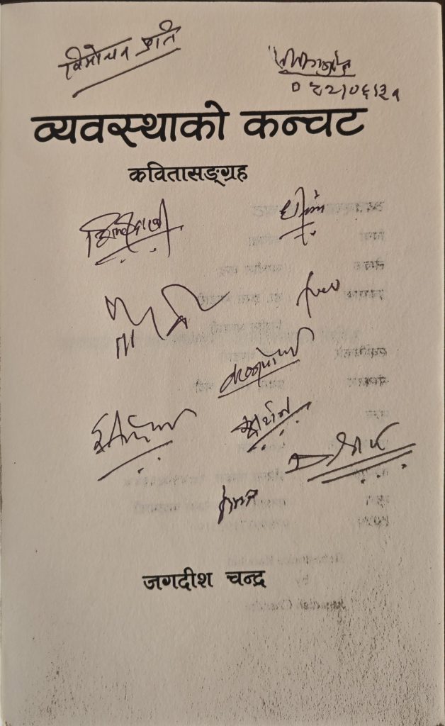काठमाडौँ : कवि जगदीश चन्द्र भण्डारीको चौथो कविता कृति “व्यवस्थाको कण्चट ” आज असोज ३१ गते एक समारोहका बीच विमोचन गरिएको छ। काठमाडौँ सेतो पुलस्थित इच्छुक साँस्कृतिक प्रतिष्ठानको हलमा एक कार्यक्रमका सन्दर्भमा क्रान्तिकारी कम्युनिस्ट पार्टी नेपालका कार्यवाहक महासचिव सीपी गजुरेल गौरवले सो पुस्तक विमोचन गर्नुभएको हो। कार्यक्रममा क्रान्तिकारी कम्युनिस्ट पार्टी नेपालका स्थायी समिति सदस्यहरु, अन्य राजनीतिकर्मी तथा साहित्यकर्मीहरूको समेत जमघट थियो । उक्त विमोचन कार्यक्रमलाई इच्छुक साँस्कृतिक प्रतिष्ठानका अध्यक्ष हिरामणि दुःखीले समन्वय गर्नुभएको थियो।