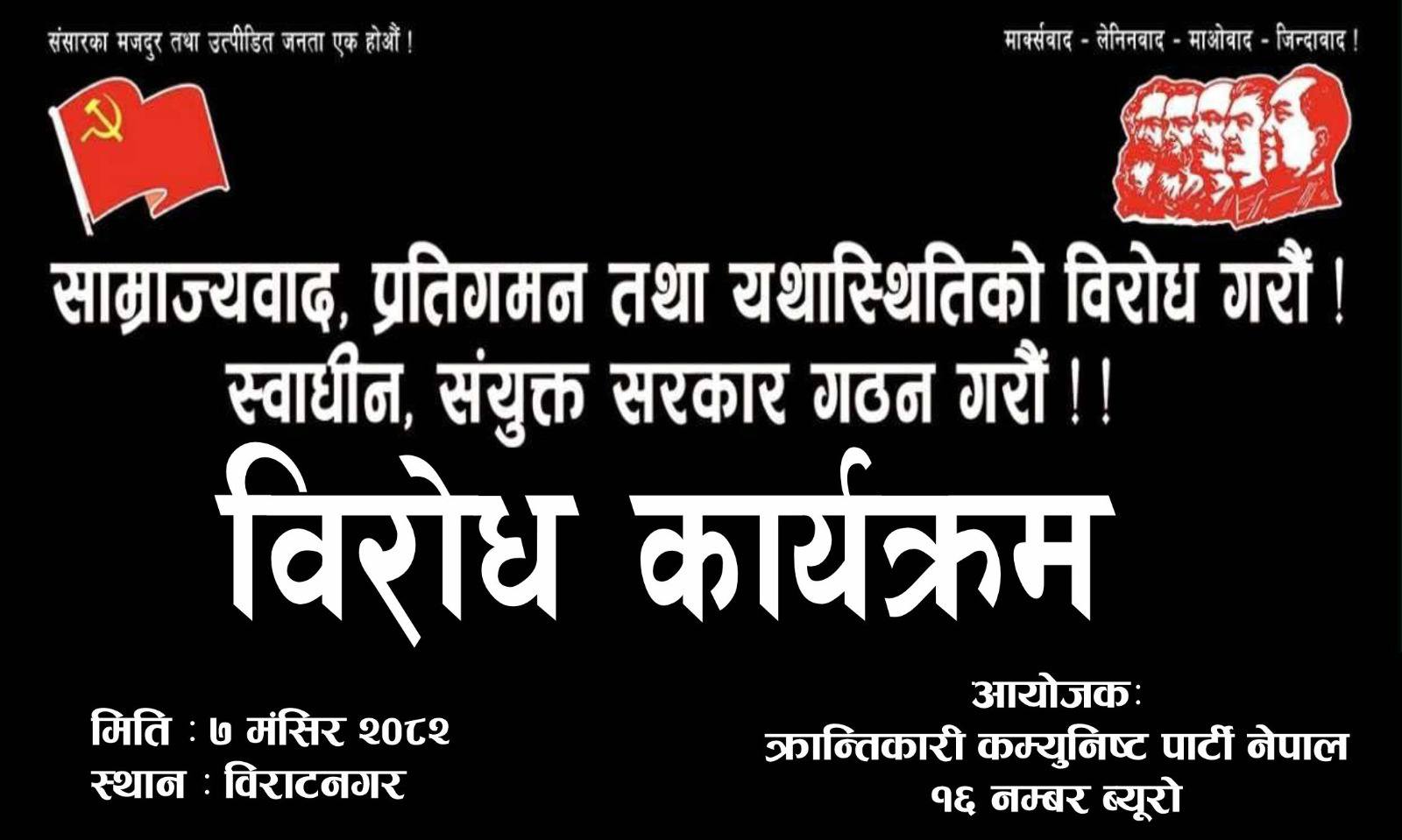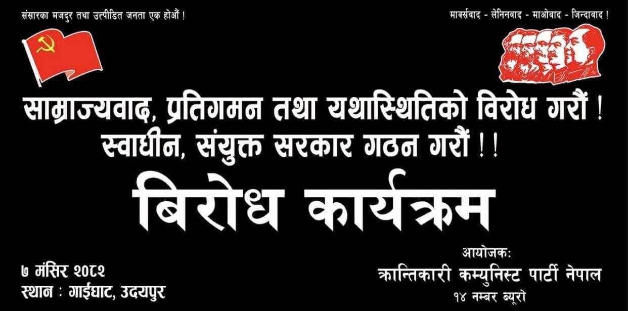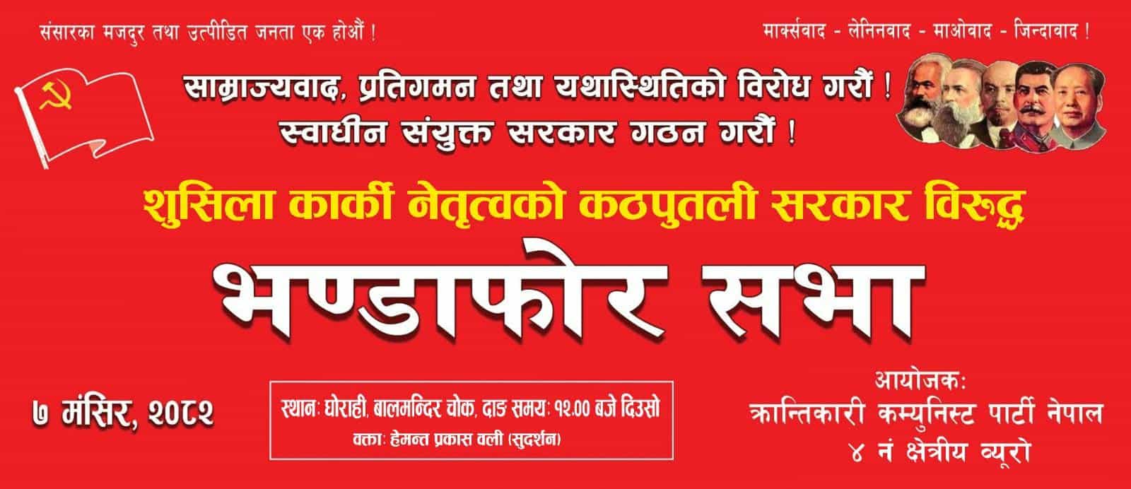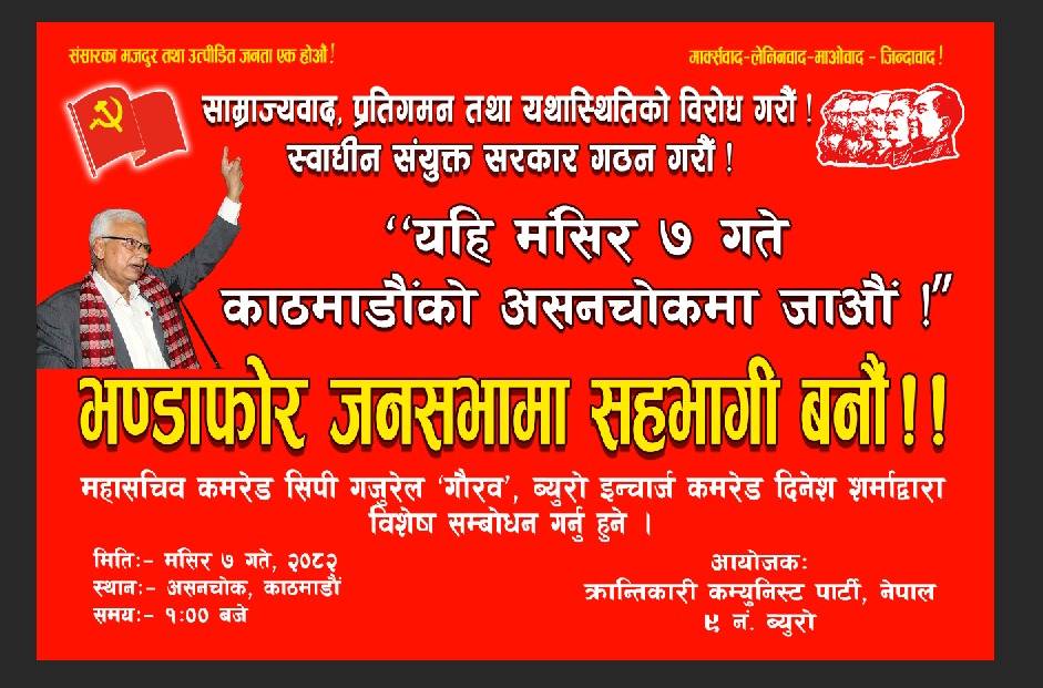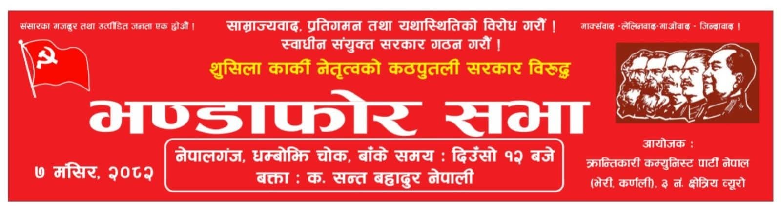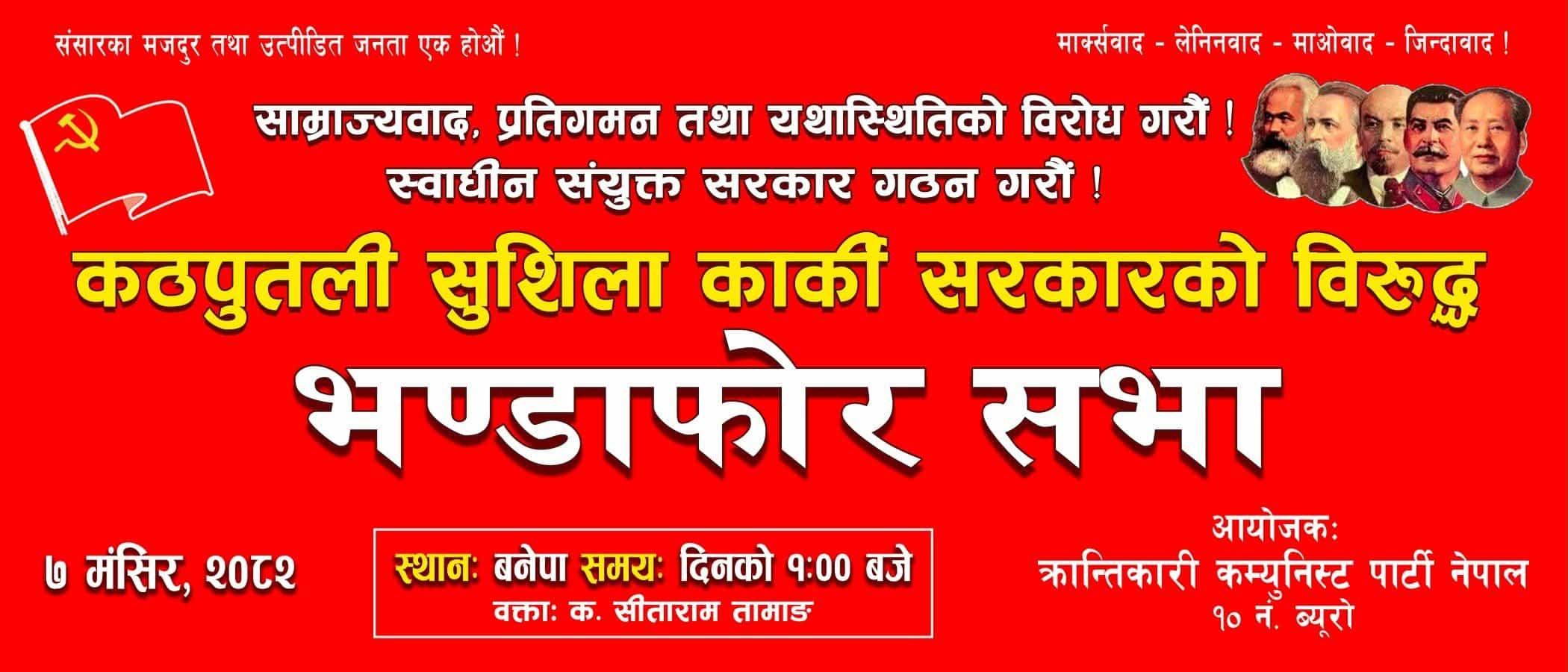 काठमाडौं : सुशिला कार्की नेतृत्वको वर्तमान साम्राज्यवादी तथा विस्तारवादीहरुको कठ्पुलती सरकारलाई अपदस्त गरी साम्राज्यवाद र विस्तारवादविरोधी सच्चा देशभक्त, प्रगतिशील तथा क्रान्तिकारी शक्तिहरुको नेतृत्वमा संयुक्त स्वाधीन सरकारको गठन गर्न सार्वजनिक आव्हान र अपिल गर्दै क्रान्तिकारी कम्युनिस्ट पार्टी नेपाले मंसिर ७ गते देशव्यापी रुपमा भण्डाफोर जनसभाको आयोजना गरिएको छ ।