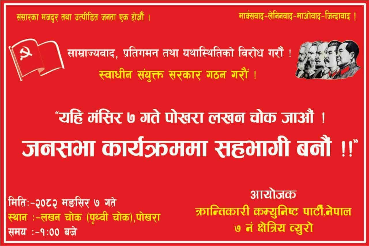 क्रान्तिकारी कम्युनिस्ट पार्टी नेपालले मंसिर ७ गते महेन्द्रनगर, धनगढी सुर्खेत, घोराही, बुटवल, बागलुङबजार, पोखरा, भरतपुर, विदुर, काठमाडौं, धुलिखेल, विरगञ्ज, धनुषा, गाईघाट, धरान र विराटनगरमा जनसभाहरुको आयोजना गरेको हो । जनसभालाई पार्टी महासचिवसहित स्थायी समिति सदस्यहरु र पोलिटब्यूरो सदस्यहरुले वक्ताको रुपमा सम्बोधन गर्ने कार्यक्रम तय गरिएको छ ।