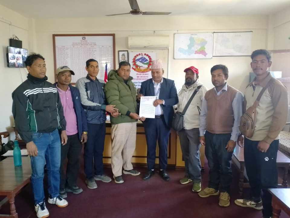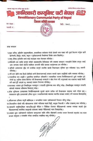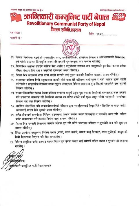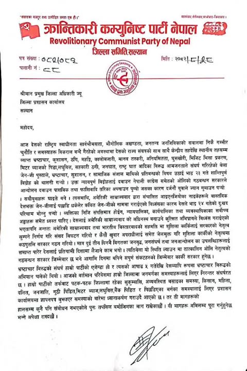 काठमाडाैँ : क्रान्तिकारी कम्युनिष्ट पार्टी नेपाल सल्यानले जिल्लाका विभिन्न समस्याहरु समाधानको माग गर्दै २०८२ मंसीर ८ गते प्रमुख जिल्ला अधिकारीलाई ज्ञापन पत्र बुझाएको छ । जिल्ला सचिवसहितको एक प्रतिनिधि मण्डलले प्रमुख जिल्ला अधिकारीलाई ज्ञापन पत्र बुझाएको हो । ज्ञापन पत्रको पूर्णपाठ यसप्रकार छ