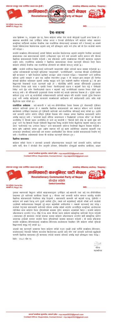 वक्तव्यमा भनिएको छ, “आजको यस महत्वपूर्ण दिनमा विश्व सर्वहारा वर्गको एउटा टुकडी हाम्रो पार्टीले नेपालको विशिष्ट सन्दर्भमा माक्र्सवाद–लेनिनवाद–माओवादलाई सिर्जनात्मक ढङ्गले लागु गरेर नयाँ जनवादी क्रान्तिको खुड्किलो पारगरी वैज्ञानिक समाजवाद हुँदै साम्यवाद तर्फको महान् यात्रामा अविचल अगाडि बढ्ने प्रतिबद्धता व्यक्त गर्दछ ।”
