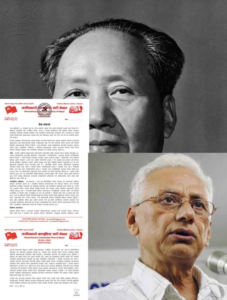 काठमाडौँ : विश्व सर्वहारावर्गका नेता माओ त्सेतुङको १३३ औं जन्म दिवसमा क्रान्तिकारी कम्युनिस्ट पार्टी नेपालका महासचिव सीपी गजुरेल गौरवले एक ऐतिहासिक महत्वको वक्तव्य जारी गर्दै ‘नयाँ जनवादी क्रान्तिको खुड्किलो पारगरी वैज्ञानिक समाजवाद हुँदै साम्यवाद तर्फको महान् यात्रामा अविचल अगाडि बढ्ने प्रतिबद्धता’ व्यक्त गर्नुभएको छ ।