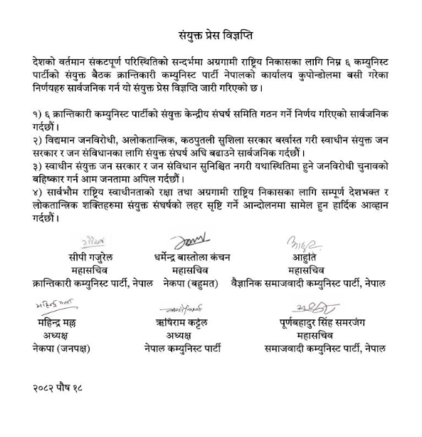 “ देशको वर्तमान संकटपूर्ण परिस्थितिको सन्दर्भमा अग्रगामी राष्ट्रिय निकासका लागि निम्न छ कम्युनिस्ट पार्टीहरूको संयुक्त बैठक क्रान्तिकारी कम्युनिस्ट पार्टी नेपालको कार्यालय कुपोण्डोलमा बसी बसी गरेका निर्णयहरु सार्वजनिक गर्न यो संयुक्त प्रेस विज्ञप्ति जारी गरिएको छ ।