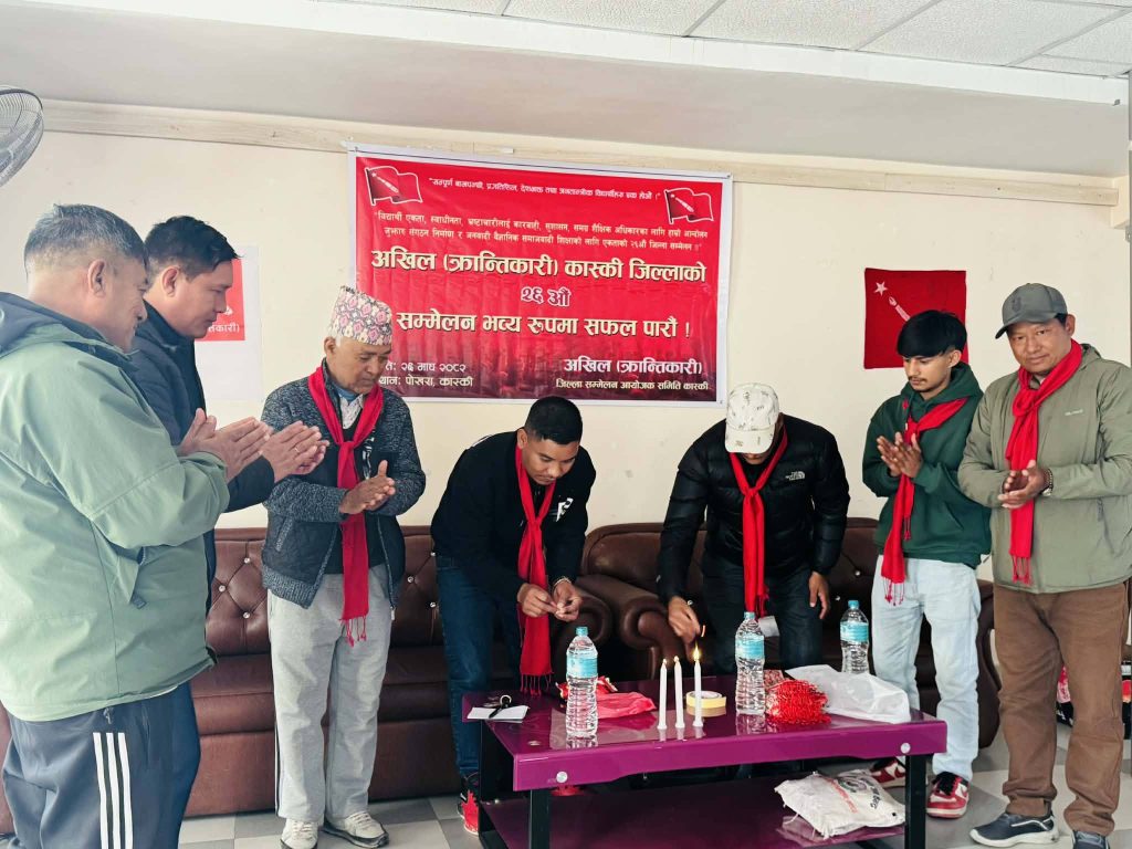 पोखरा: अखिल (क्रान्तिकारी) कास्कीको २६औ जिल्ला सम्मेलन साेमबार सम्पन्न भएको छ । सम्मेलनले सन्देश परियारको अध्यक्षतामा तीन रिक्त सहित २१ सदस्यीय जिल्ला समिति निर्वाचित गरेको छ । त्यस्तै उपाध्यक्षहरु, सचिव, सहसचिब र कोशाषध्यक्ष्यमा क्रमश ः अस्मिता मकक्रान्ती, हिरालाल बिश्वकर्मा,सुर्य गुरुङ, दिपु परियार र कृस गुरुङ रहेका छन । सदस्यहरुमा क्रमशः जय घर्ती, मानसा सुनार, इन्द्र क्षेत्री,आशिका जिसि, आयुस परियार, सुदिप गुरुङ र कुशल गुरुङ रहेका छन ।