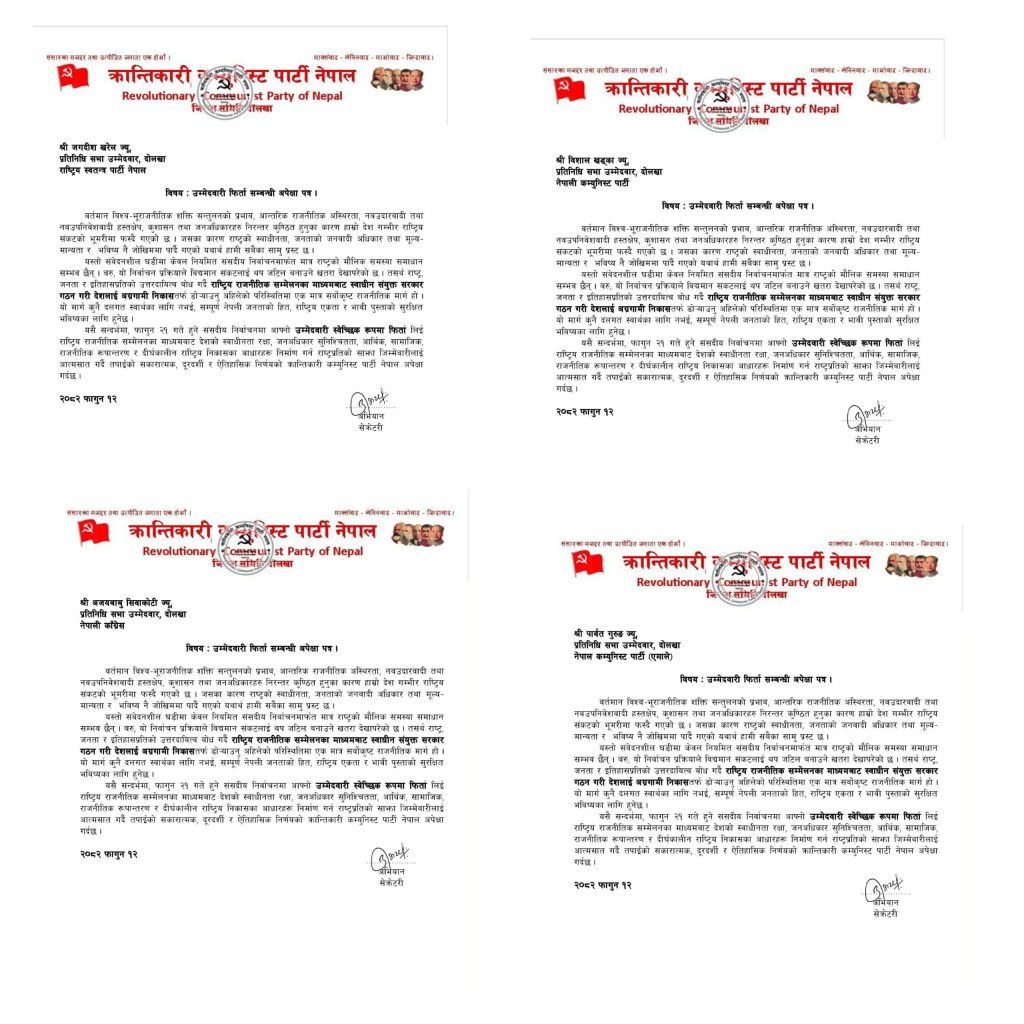 काठमाडौं : क्रान्तिकारी कम्युनिस्ट पार्टी नेपाल दोलखाले फागुन २१ को संसदीय निर्वाचनमा उम्मेदवारी दिएकाहरुलाई उम्मेदवारी फिर्ता लिन आग्रह गर्दै पत्राचार गरेको छ । पार्टीका जिल्ला सेक्रेटरी अभियानको हस्तक्षरमा जिल्लाबाट उम्मेदवार बनेका प्रमुख चार पार्टीका उम्मेदवारहरुलाई आफ्नो उम्मेदवारी फिर्ता लिन आग्रह गर्दै यस्तो पत्राचार गरिएको हो ।