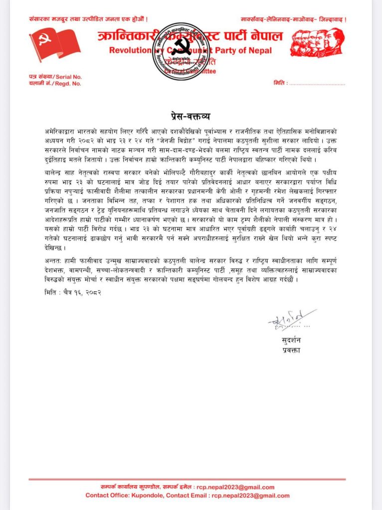 बालेन्द्र साह नेतृत्वको रास्वपा सरकार बनेको भोलिपल्टै गौरीबहादुर कार्की नेतृत्वको छानबिन आयोगले एक पक्षीय रुपमा भाद्र २३ को घटनालाई मात्र जोड दिई तयार पारेको प्रतिवेदनलाई आधार बनाएर सरकारद्वारा पर्याप्त विधि प्रक्रिया नपु¥याई फासीवादी शैलीमा तत्कालीन सरकारका प्रधानमन्त्री केपी ओली र गृहमन्त्री रमेश लेखकलाई गिरफ्तार गरिएको छ । जनताका विभिन्न तह, तप्का र पेशागत हक तथा अधिकारको प्रतिनिधित्व गर्ने जनवर्गीय सङ्गठन, जनजाति सङ्गठन र ट्रेड युनियनहरूमाथि प्रतिबन्ध लगाउने ध्येयका साथ चेतावनी दिने लगायतका कठपुतली सरकारका आदेशहरूप्रति हाम्रो पार्टीको गम्भीर ध्यानाकर्षण भएको छ । सरकारको यो काम ट्रम्प शैलीको नेपाली संस्करण मात्र हो । यसको हाम्रो पार्टी विरोध गर्दछ । भाद्र २३ को घटनामा मात्र आधारित भएर पूर्वाग्रही ढङ्गले कार्बाही चलाउनु र २४ गतेको घटनालाई ढाकछोप गर्नु भावी सरकारमै पर्न सक्ने अपराधीहरुलाई सुरक्षित राख्ने खेल थियो भन्ने कुरा स्पष्ट देखिन्छ ।