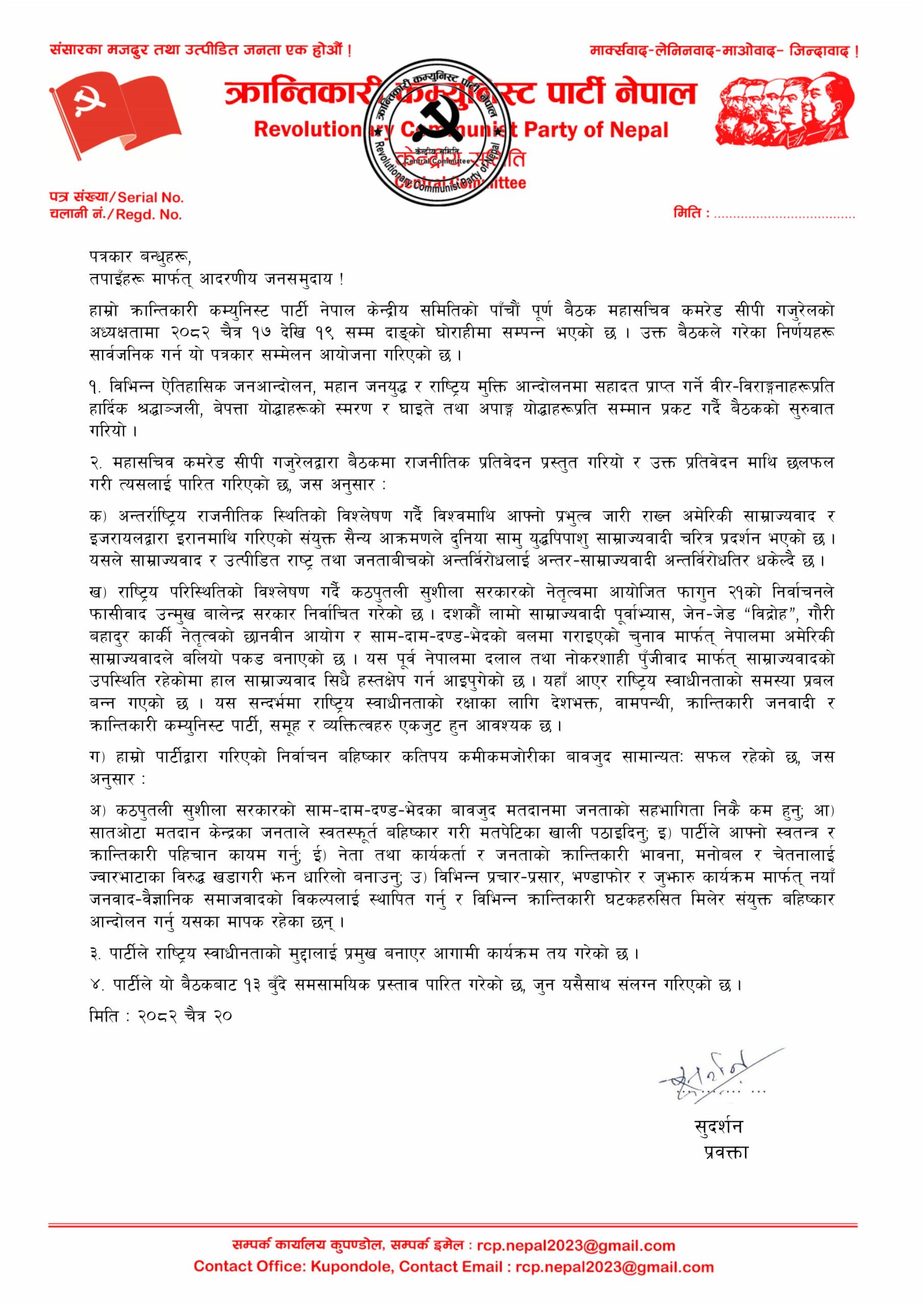 पार्टीका प्रवक्ता सुदर्शनको हस्तक्षरमा जारी प्रेस वक्तव्यमा भनिएको छ,