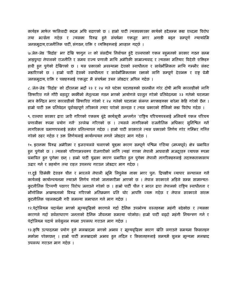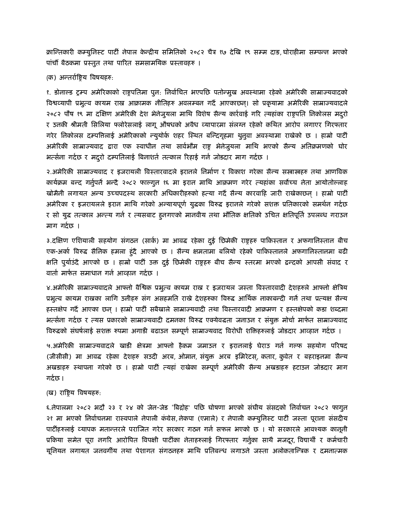 ख) राष्ट्रिय परिस्थितिको विश्लेषण गर्दै कठपुतली सुशीला सरकारको नेतृत्वमा आयोजित फागुन २१को निर्वाचनले फासीवाद उन्मुख बालेन्द्र सरकार निर्वाचित गरेको छ । दशकौं लामो साम्राज्यवादी पूर्वाभ्यास, जेन–जेड “विद्रोह”, गौरी बहादुर कार्की नेतृत्वको छानवीन आयोग र साम–दाम–दण्ड–भेदको बलमा गराइएको चुनाव मार्फत् नेपालमा अमेरिकी साम्राज्यवादले बलियो पकड बनाएको छ । यस पूर्व नेपालमा दलाल तथा नोकरशाही पुँजीवाद मार्फत् साम्राज्यवादको उपस्थिति रहेकोमा हाल साम्राज्यवाद सिधै हस्तक्षेप गर्न आइपुगेको छ । यहाँ आएर राष्ट्रिय स्वाधीनताको समस्या प्रबल बन्न गएको छ । यस सन्दर्भमा राष्ट्रिय स्वाधीनताको रक्षाका लागि देशभक्त, वामपन्थी, क्रान्तिकारी जनवादी र क्रान्तिकारी कम्युनिस्ट पार्टी, समूह र व्यक्तित्वहरु एकजुट हुन आवश्यक छ ।