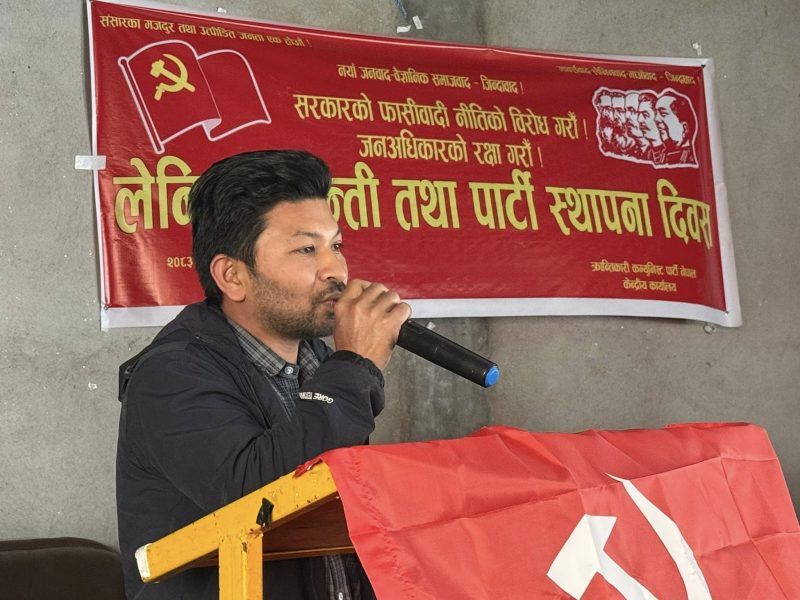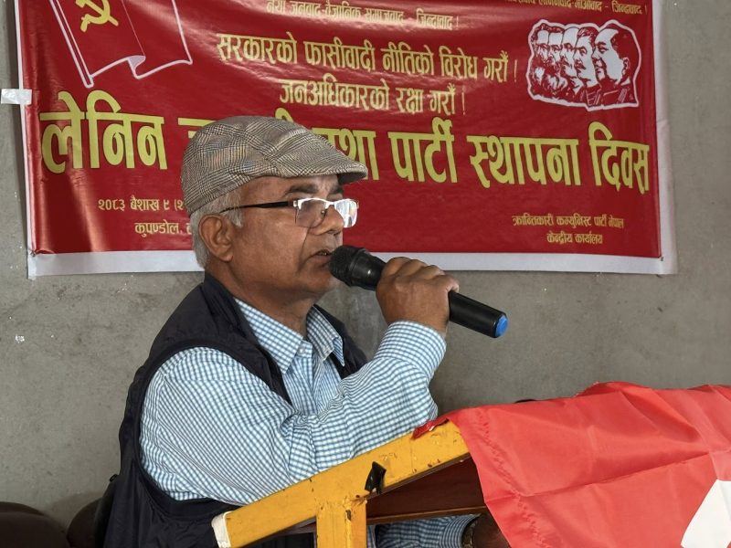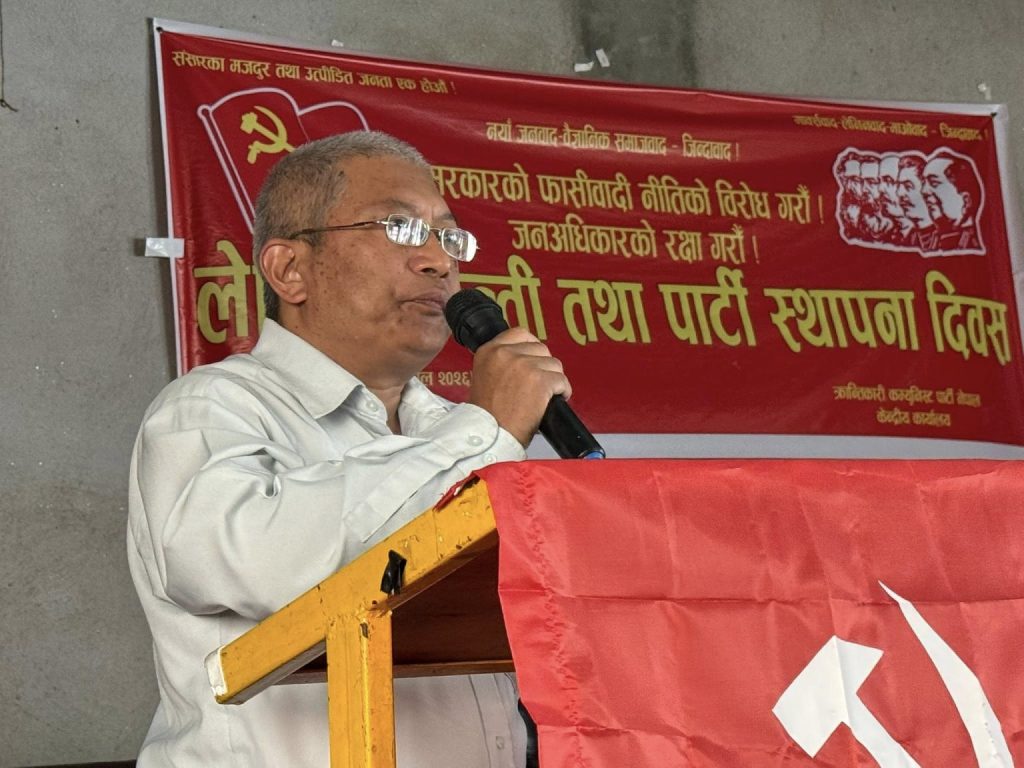 उहाँले अगाडि भन्नुभयो, ‘अमेरिकामा तालिम दिएका तिब्बतीयनहरुलाई नेपालमा गुम्बा बनाएर राखेको छ । उनीहरुलाई खर्च आफैले दिएको भनिरहेको छ । अमेरिकी एम्बेसीले नेपाली युवाहरुको भर्ती खोलेको छ । त्यसको काउन्टरमा चीनको दुताबासले पनि नेपाली युवाहरुको अर्को भर्ती खोलेको । इरानमाथि अमेरिका–इजरायलले थोपरेको अन्यायपूर्ण युद्धको विरुद्धमा चीन पनि खडा भएको छ । शक्तिशाली राष्ट्रहरु विभाजित भएको अवस्थामा विश्वयुद्ध हुन सक्ने पनि अनुमान र विश्लेषणहरु भइरहेका छन् । स्थिति सामान्य छैन । क्रान्तिकारीहरु शक्तिहरु सचेत र संगठित बन्न जरुरी छ ।’